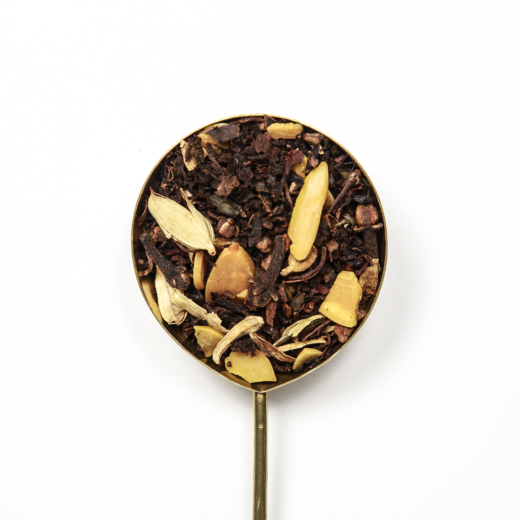 Indian green tea, cinnamon, almond cloves, and cardamom. This blend is lower in caffeine, but no less spicy than our other chais.