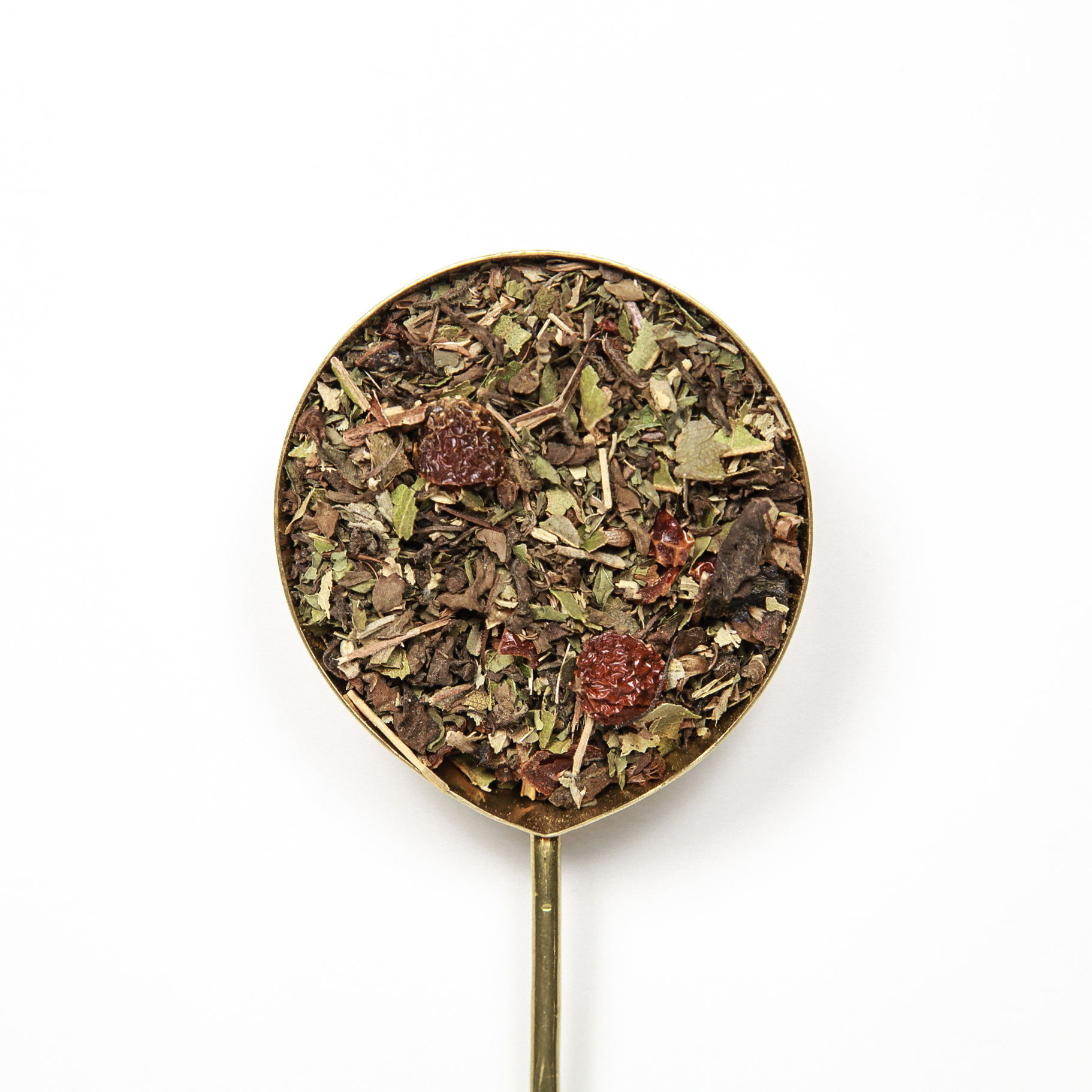 Holy Basil, spearmint, rosehips, lemon myrtle, and linden blossoms. A perfect balance of mint, basil, and floral elements